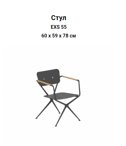 Плавные органические линии литой алюминиевой рамы прерывают только конические подлокотники из тикового дерева, создающие теплый элемент дизайна. В бесшовной интегрированной изогнутой пластине спинки есть два X-образных отверстия, которые служат не только как эстетические элементы, но и как точки фиксации подушки спинки. Они крепятся с помощью Х-образных ручек, которые стандартно соответствуют цвету рамы. Подлокотники также предлагаются в качестве опции в тон подлокотников. Они делают кресло Exes еще более привлекательным.